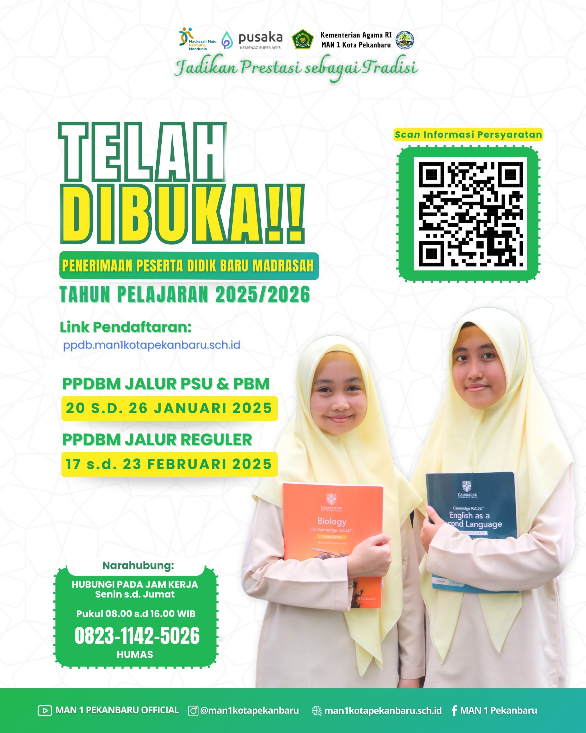 Resmi dibuka! Pendaftaran siswa baru MAN 1 Kota Pekanbaru. Jadi bagian dari keluarga besar MAN 1 dan raih prestasi gemilang!